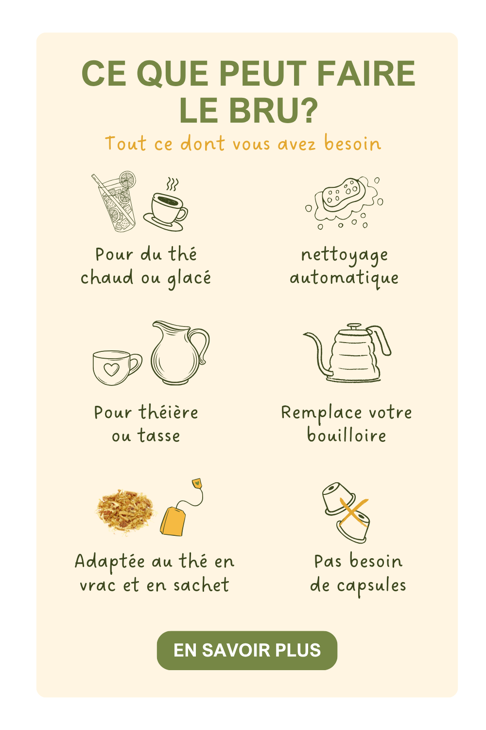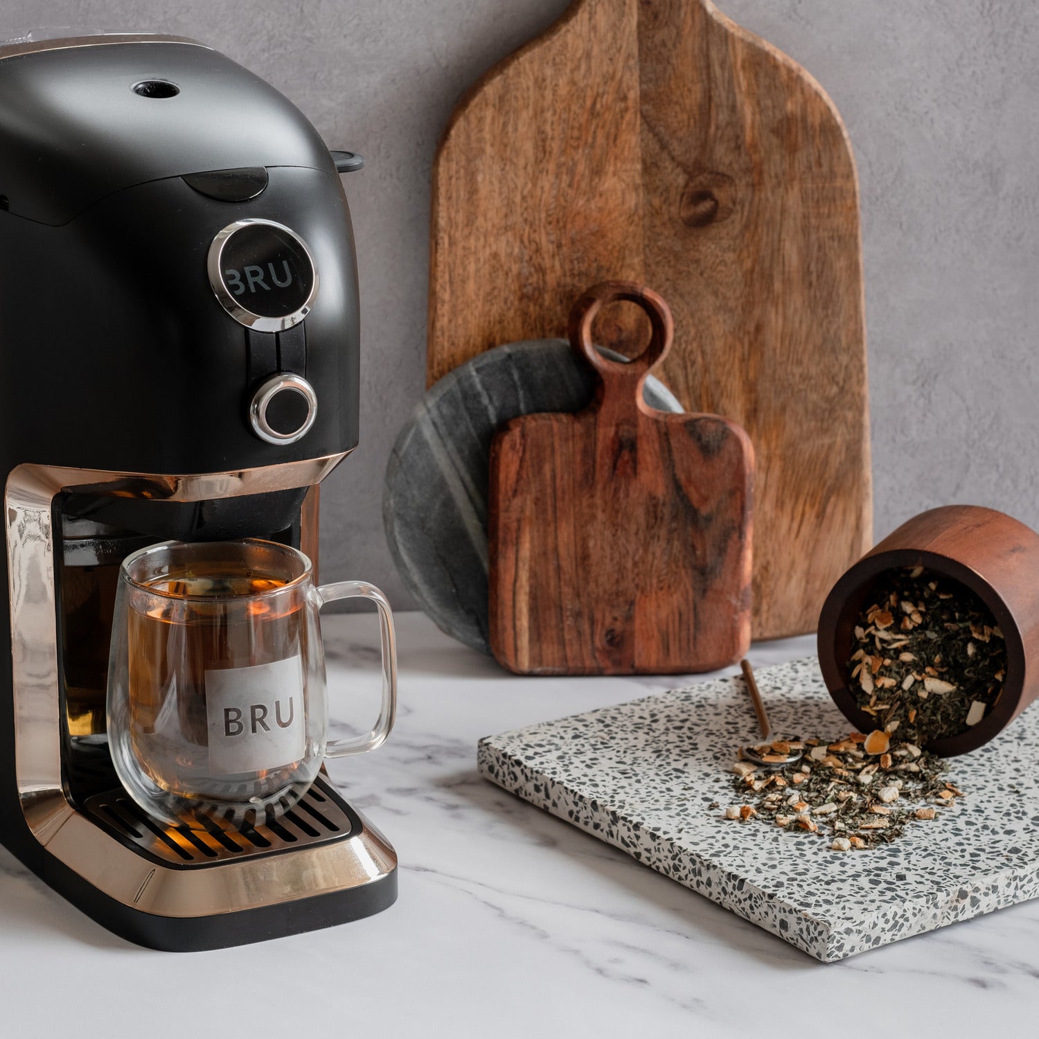 La machine à thé BRU fonctionne avec du thé en vrac, des sachets de thé et tout type de tisane. Vous choisissez ce que vous voulez infuser et ne dépendez pas des marques de thé ou des capsules de thé en plastique.