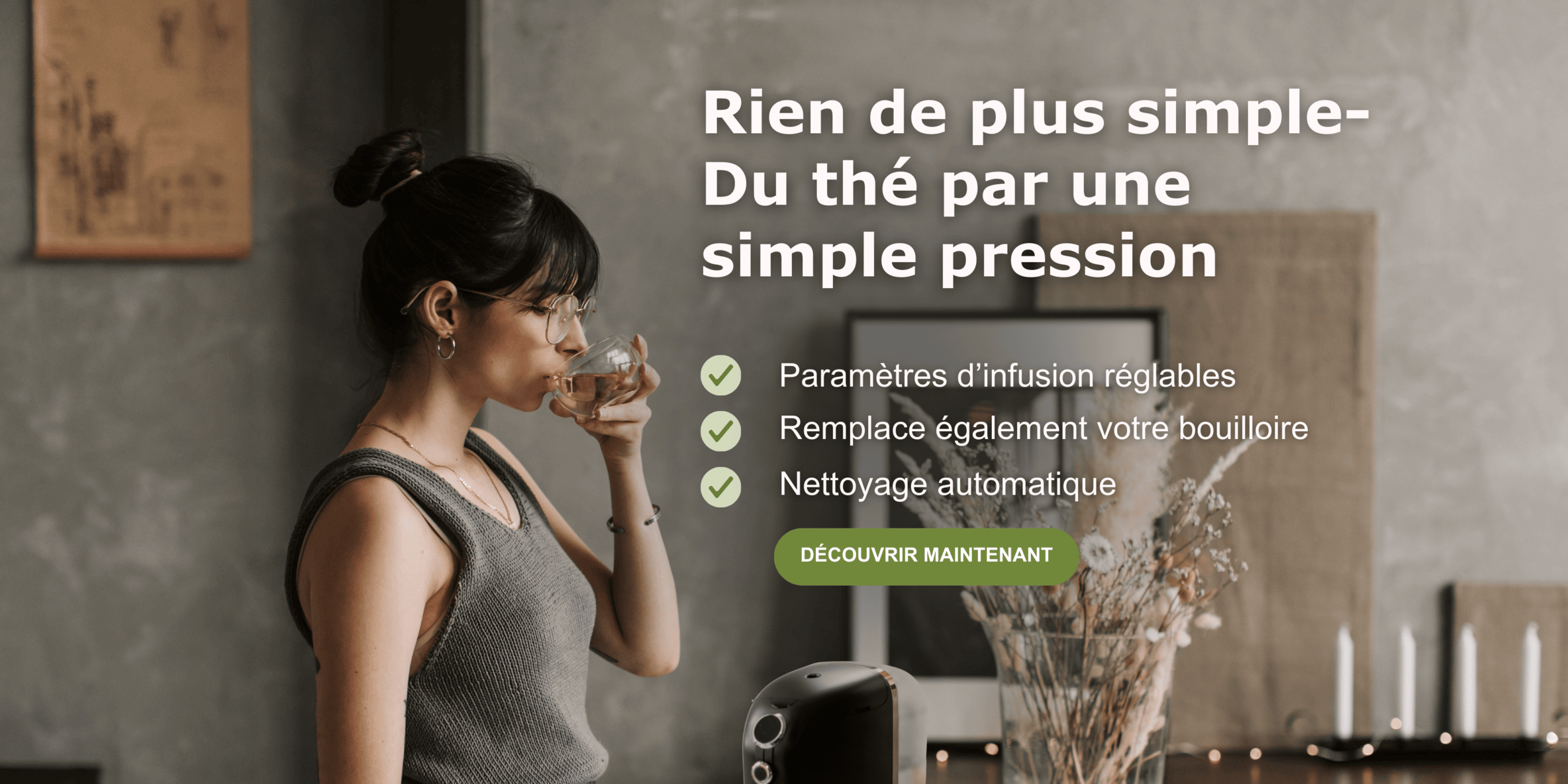 Sélectionnez simplement la quantité d'eau, la température et le temps d'infusion et vous pourrez déguster votre thé en toute sérénité.